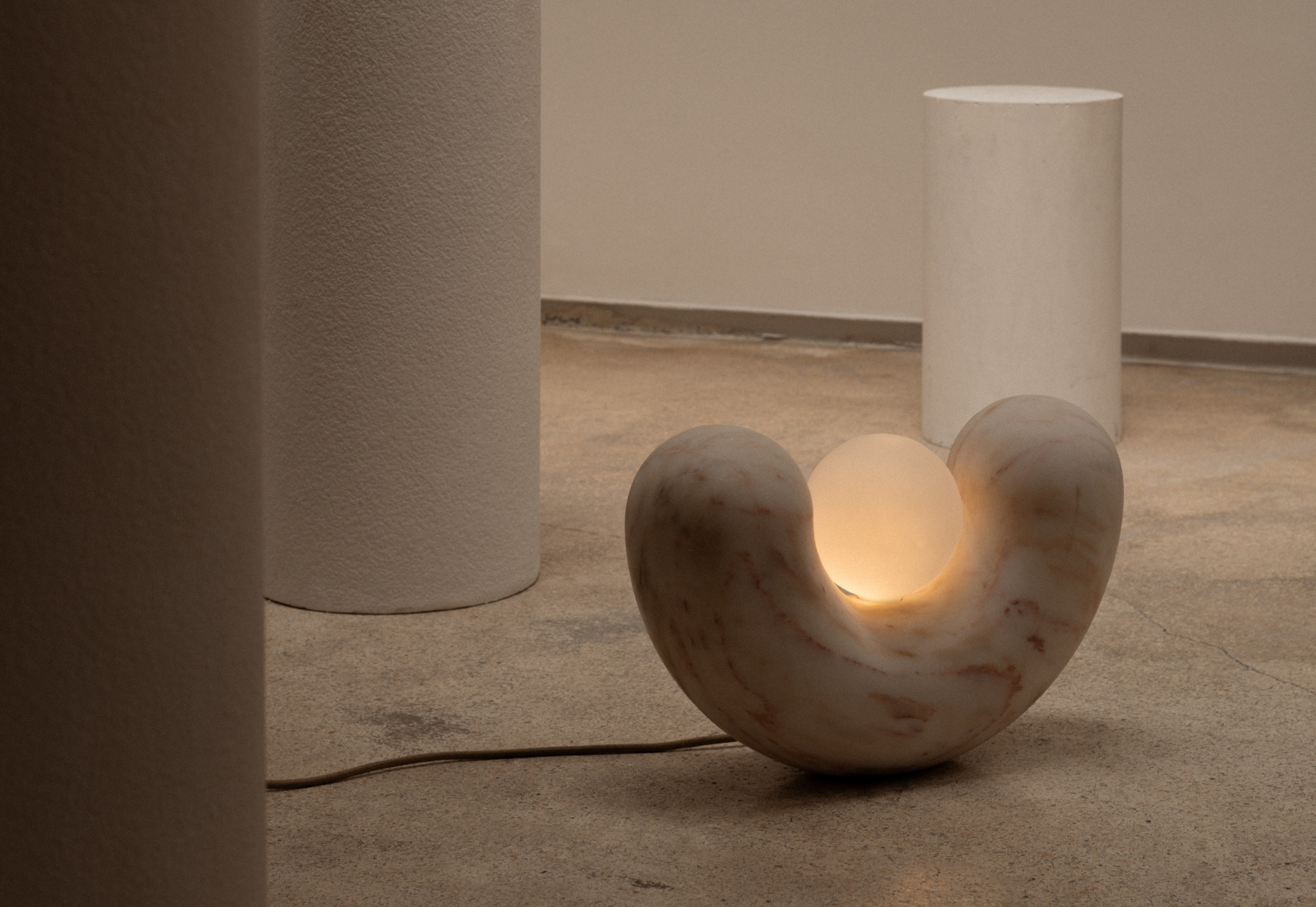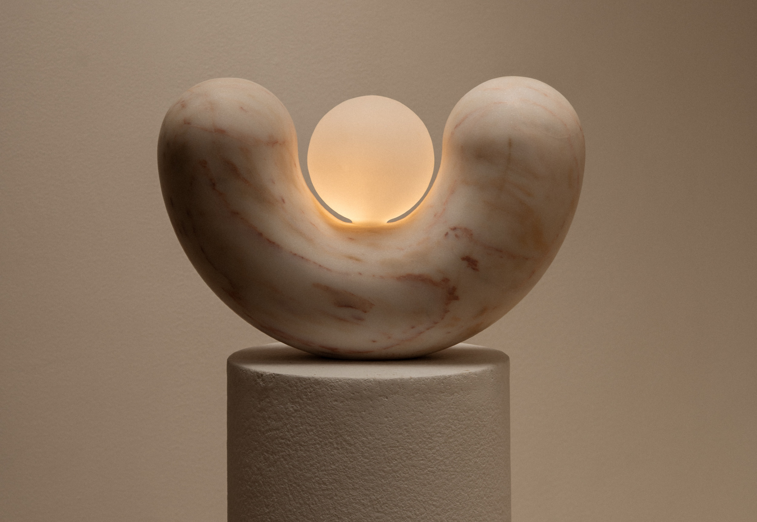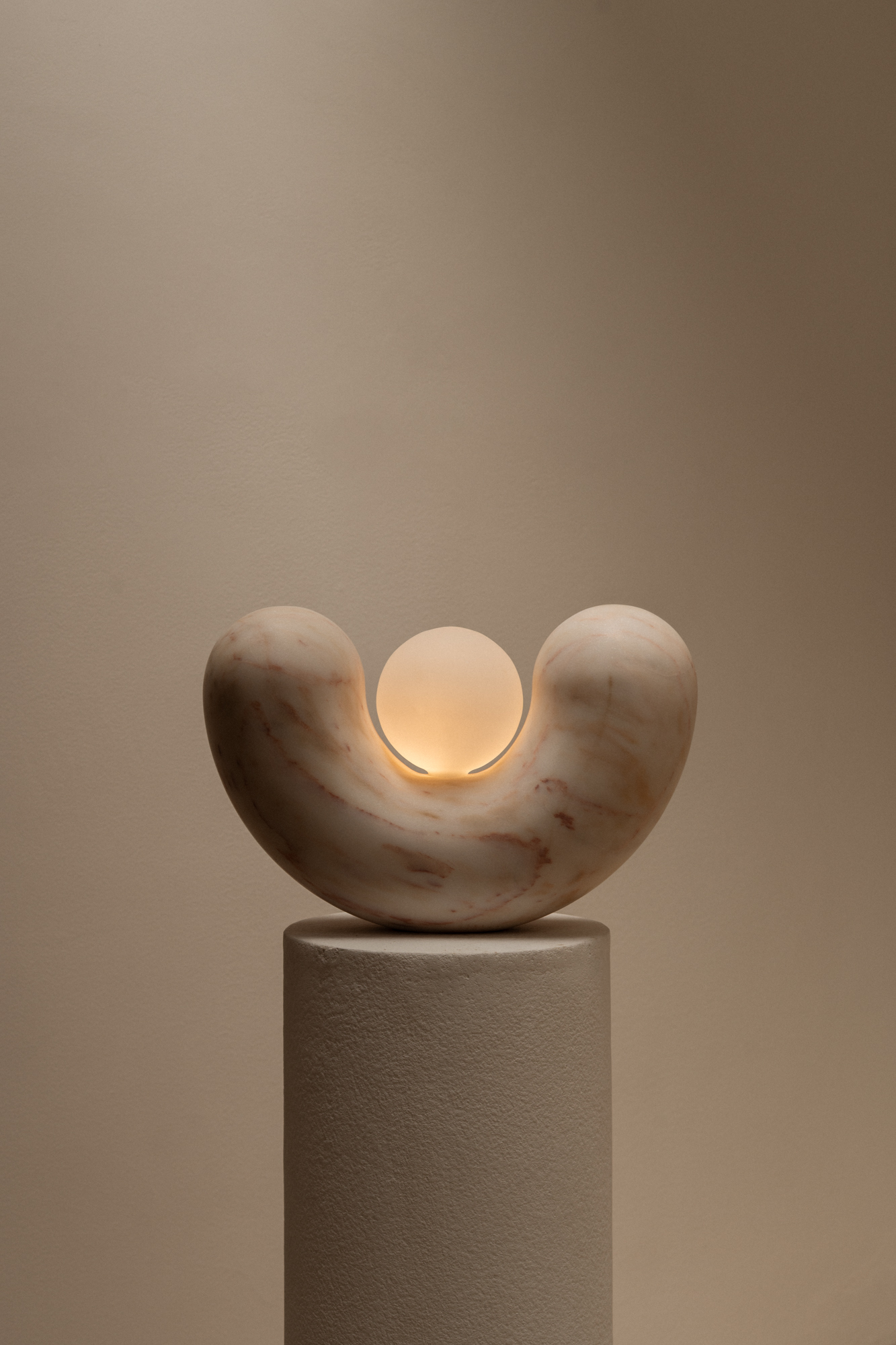 The U-shaped support, available in travertine, delicately embraces a mouth-blown glass